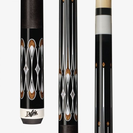 This new Dufferin® cue features an old smoke-stained Canadian Hard Rock Maple forearm and butt with graphic black & white points, pearled diamond accents, solid black double-pressed Irish linen wrap, and Everest tip.