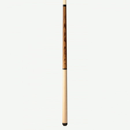 Sleek and simple natural Maple/Zebrawood half-and-half design jump/break cue with two quick-release joints, black Implex collar, sleek wrapless handle.