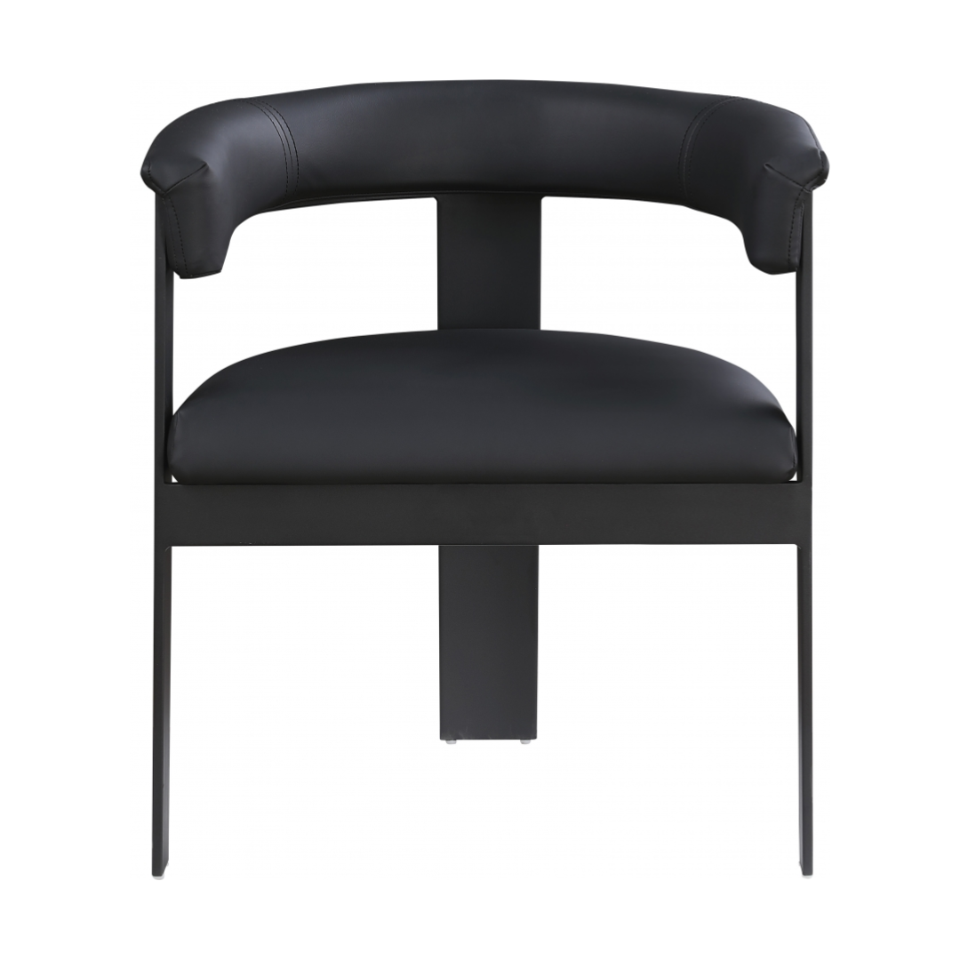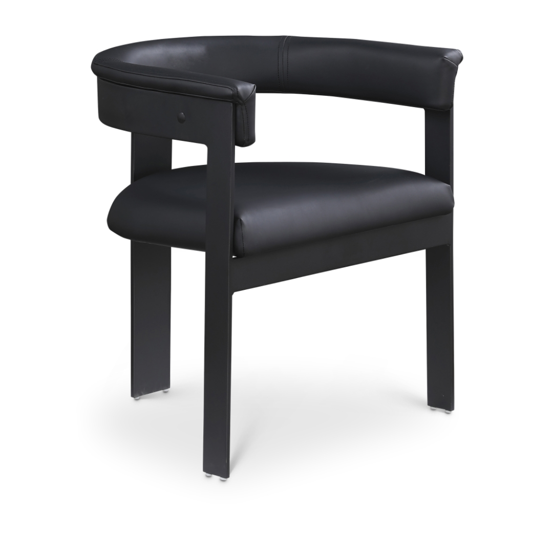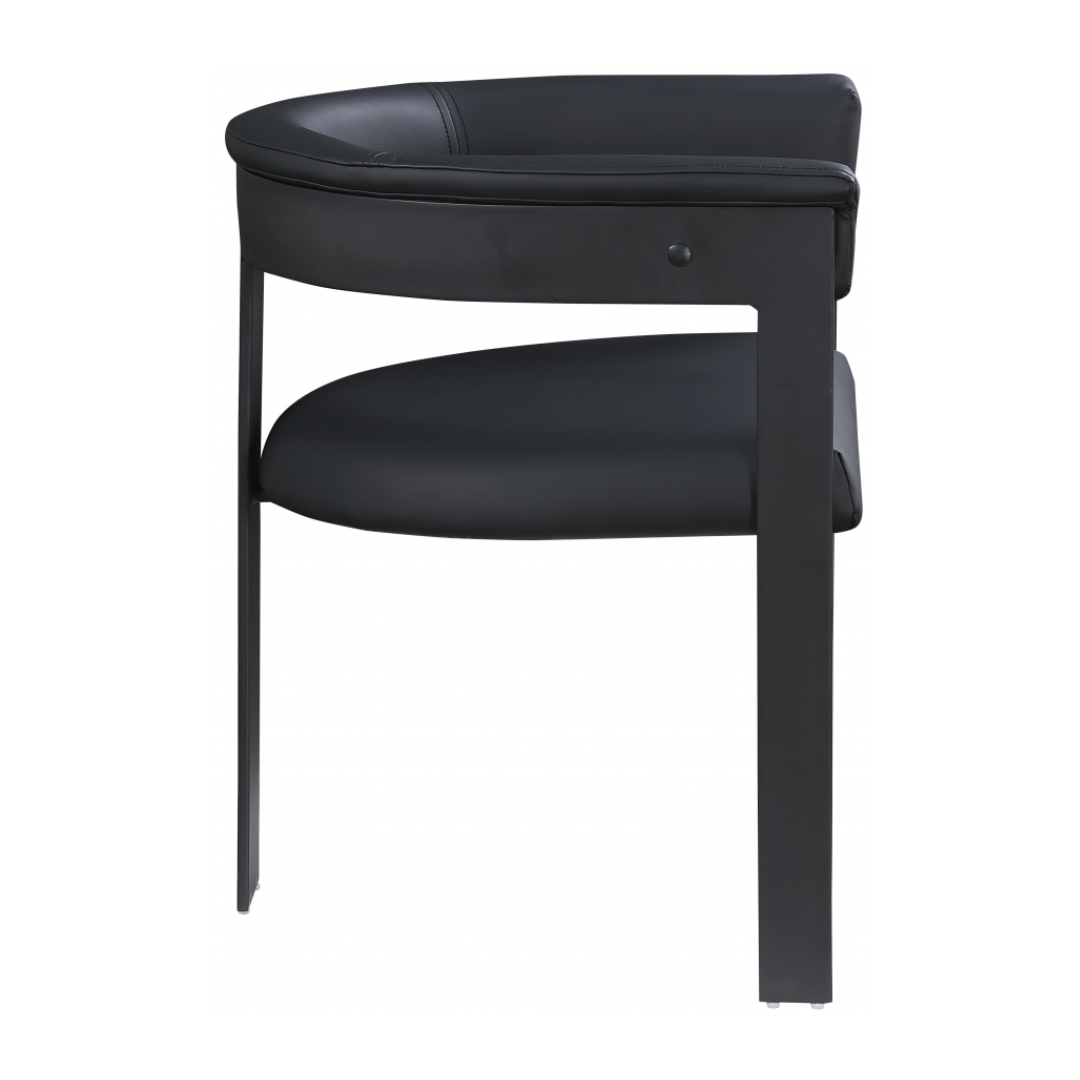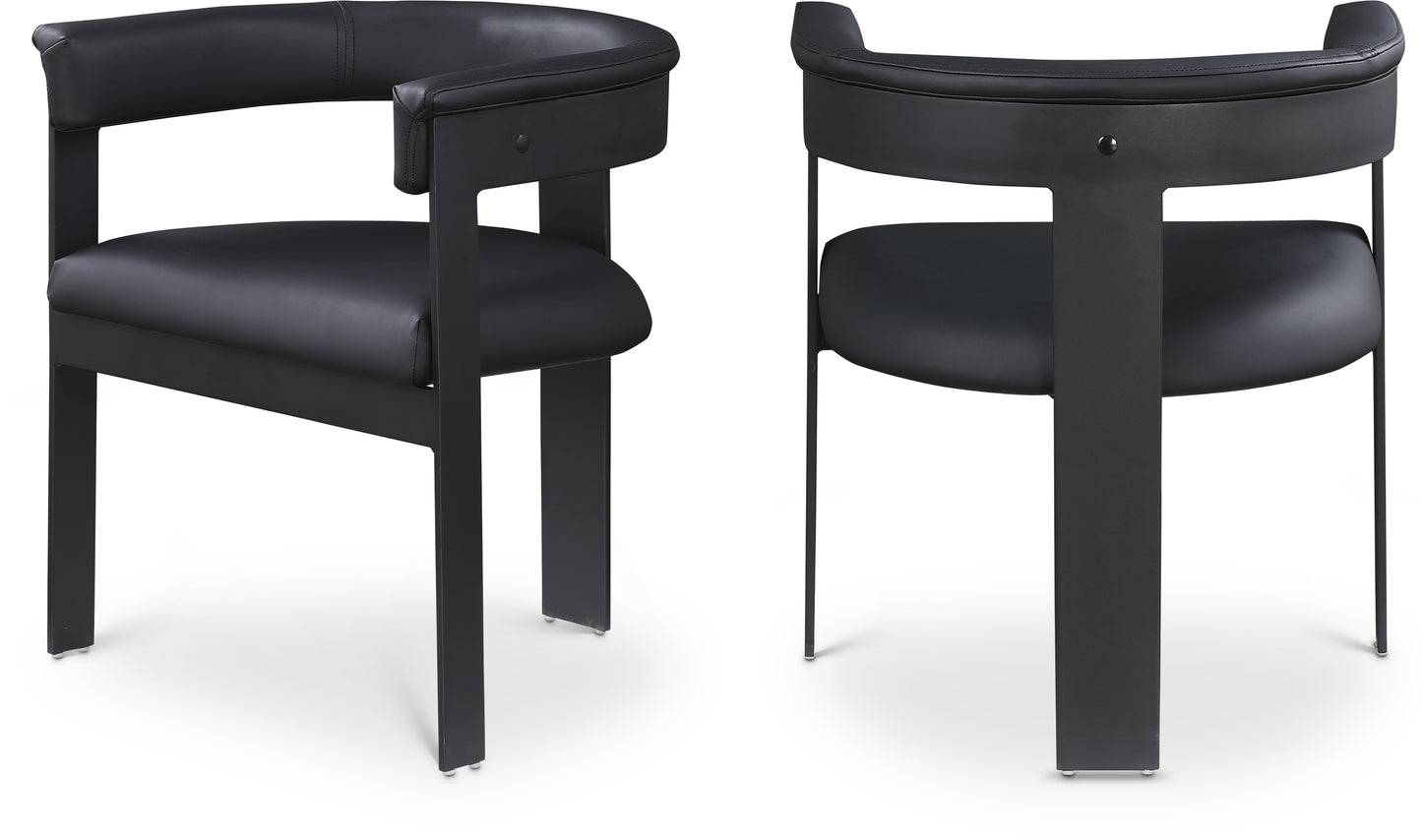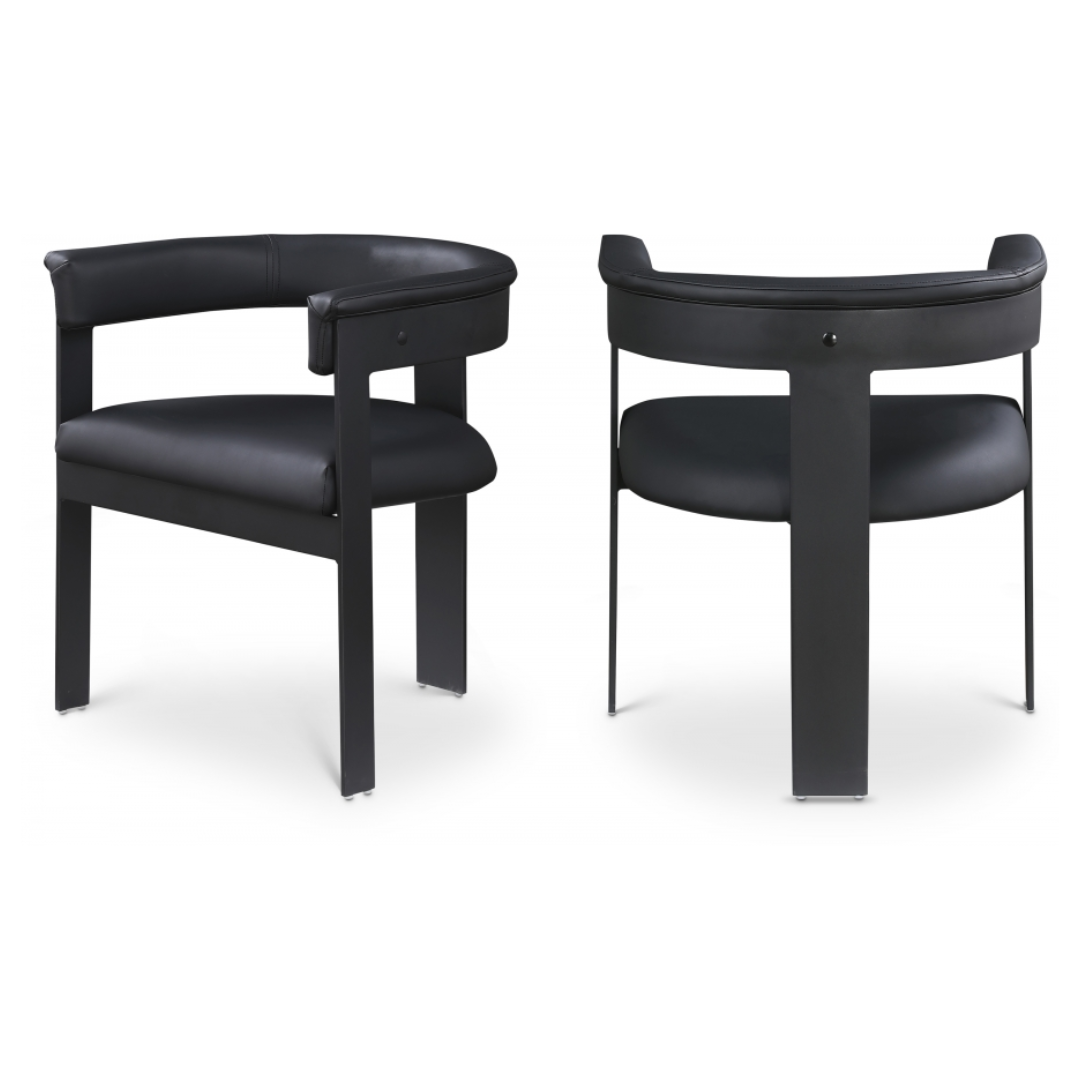 Rehab your dining area with these black Romeo vegan leather dining chairs, sold as a set of two. These chairs offer both style and comfort, with soft black vegan leather seats and backs providing a sleek and inviting look that meshes well with an array of dining tables. The matte black metal frame ensures durability and modern aesthetic appeal, while the chairs' curved backs deliver lumbar support for a relaxed dining experience.