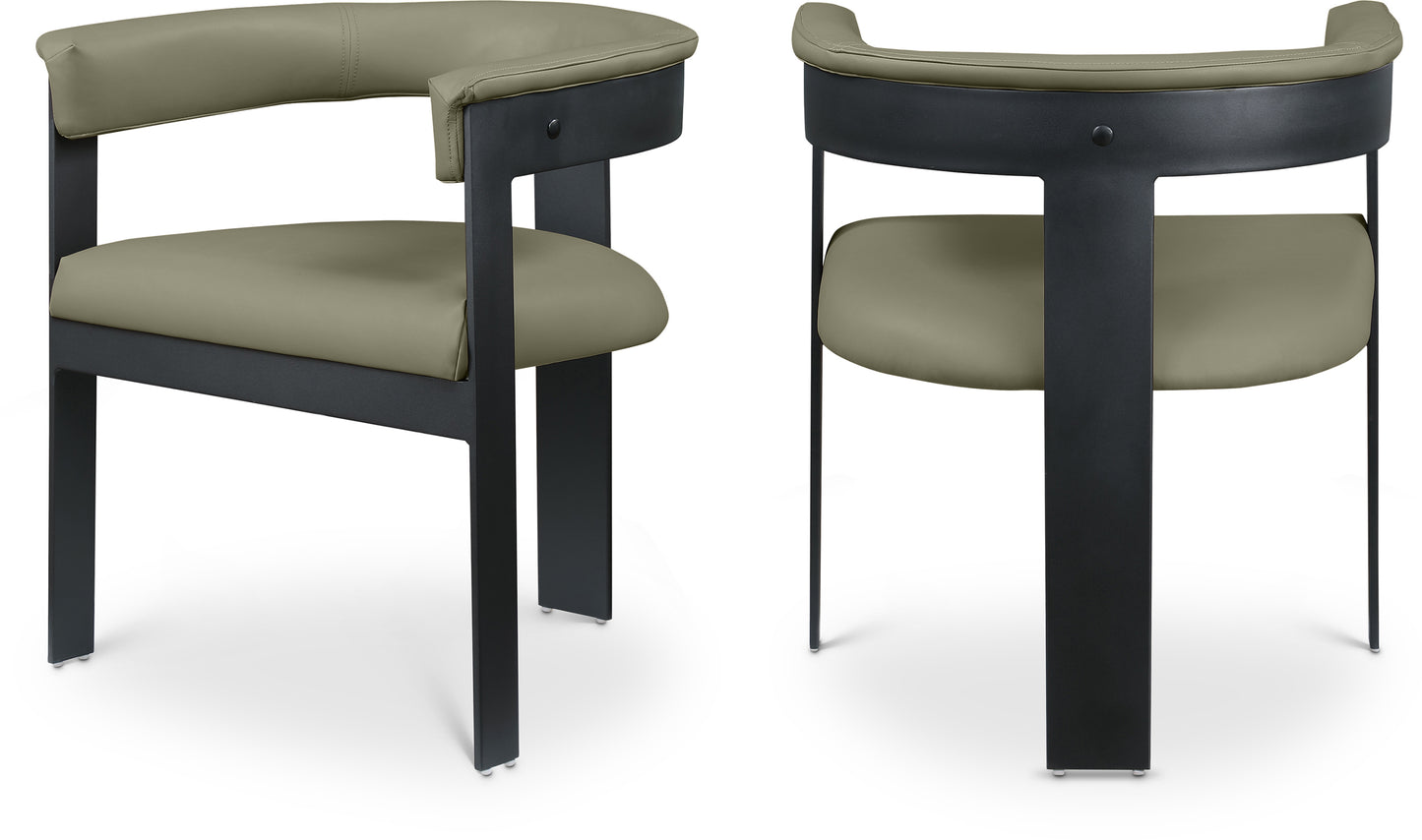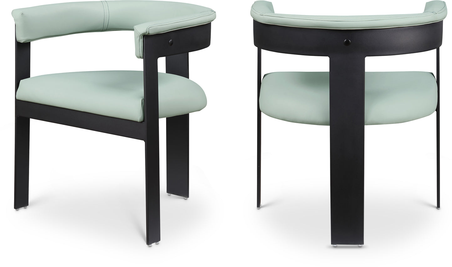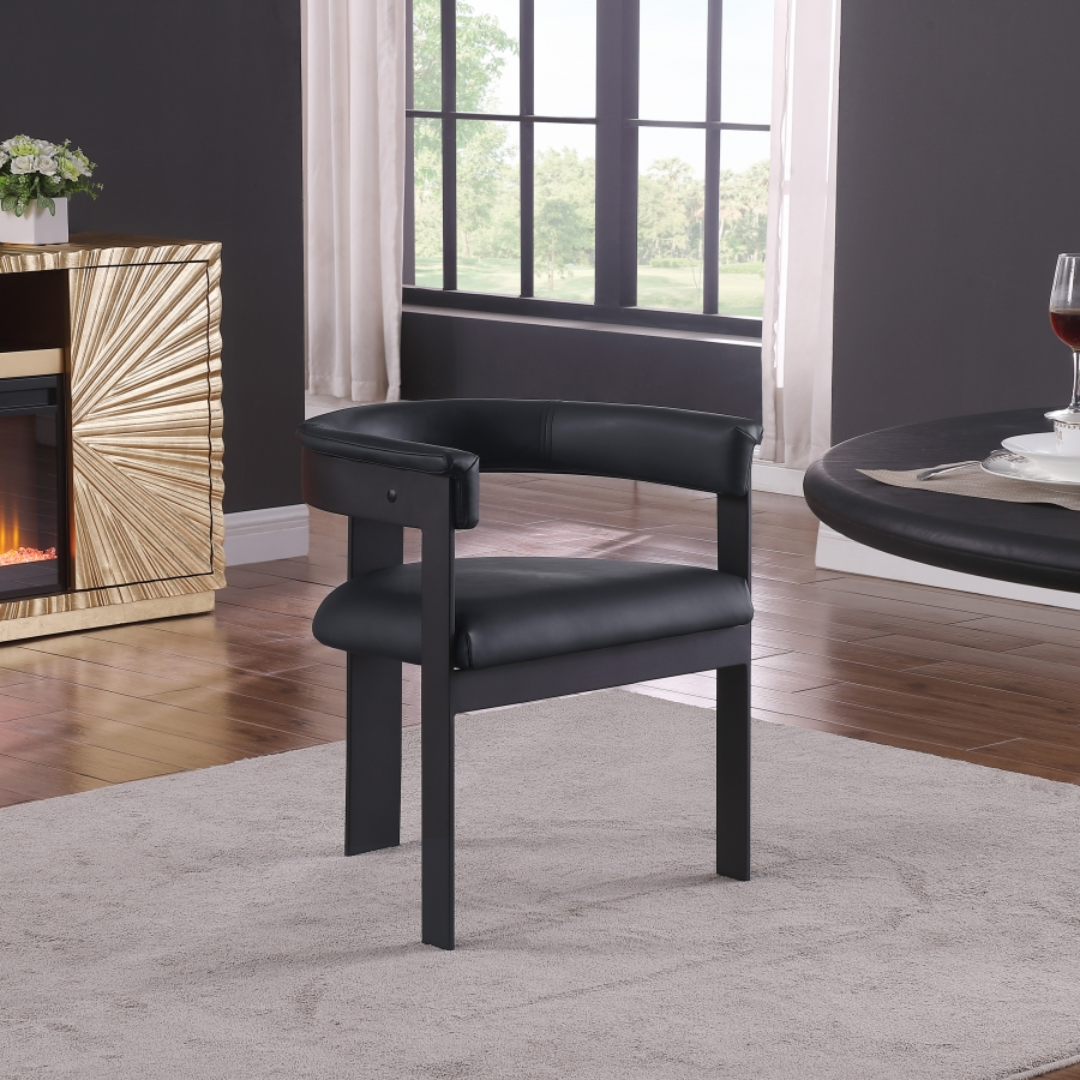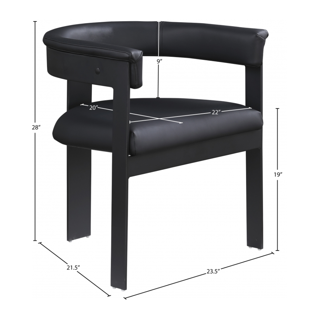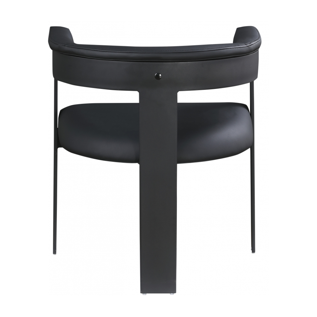 Rehab your dining area with these black Romeo vegan leather dining chairs, sold as a set of two. These chairs offer both style and comfort, with soft black vegan leather seats and backs providing a sleek and inviting look that meshes well with an array of dining tables. The matte black metal frame ensures durability and modern aesthetic appeal, while the chairs' curved backs deliver lumbar support for a relaxed dining experience.