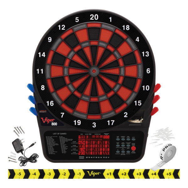 Become a virtuoso of darts with the Viper 800 Electronic Dartboard. This electronic dartboard features a regulation-sized 15.5” target area with target tested tough segments to withstand your toughest throws again and again. There are 57 programmed games and 400 scoring options so you can play however you want. It supports up to 16 player multiplayer and comes with a built-in handicap feature so regardless of skill, everyone can play. The Viper 800 also displays your points per dart (PPD) and marks per round (MPR) statistics for games of 01 and Cricket after the game, so you’ll know how you’re doing and what you can improve on. This electronic dartboard comes with six soft tip darts, 24 spare dart tips, and is powered by the included AC adapter.