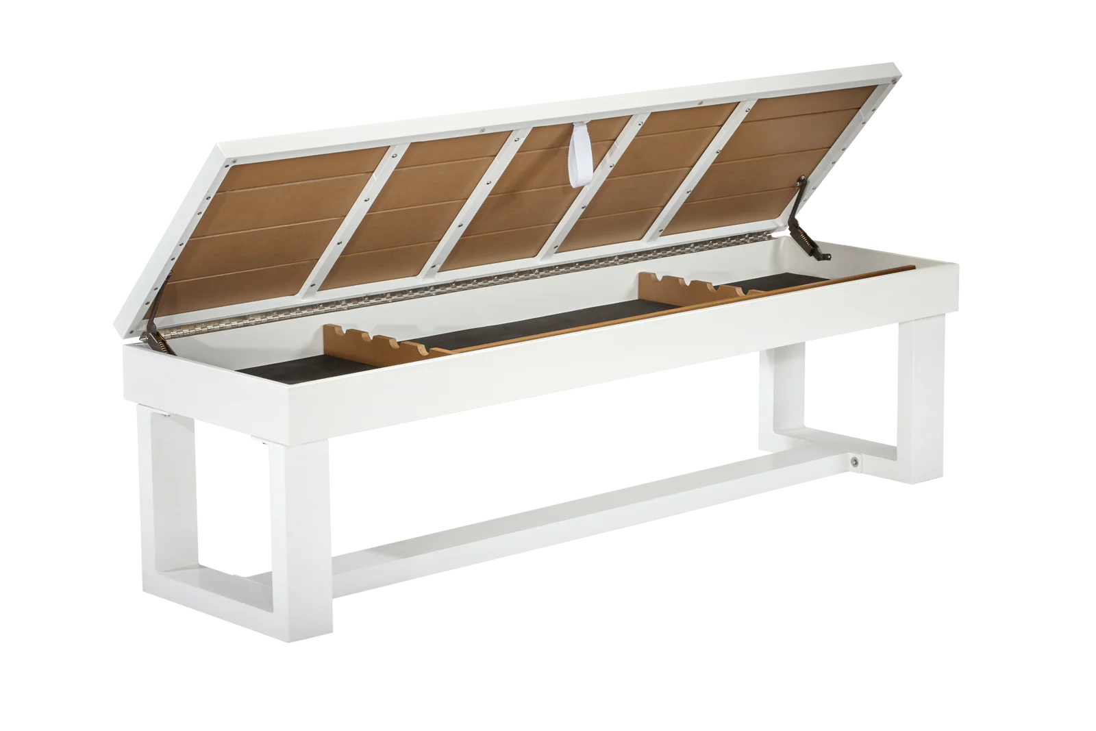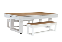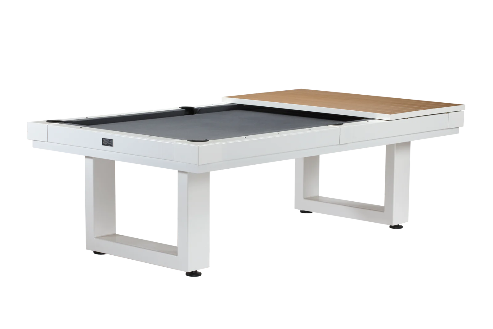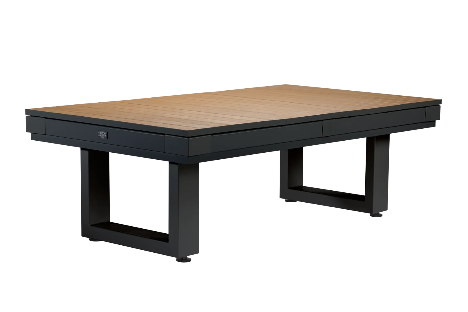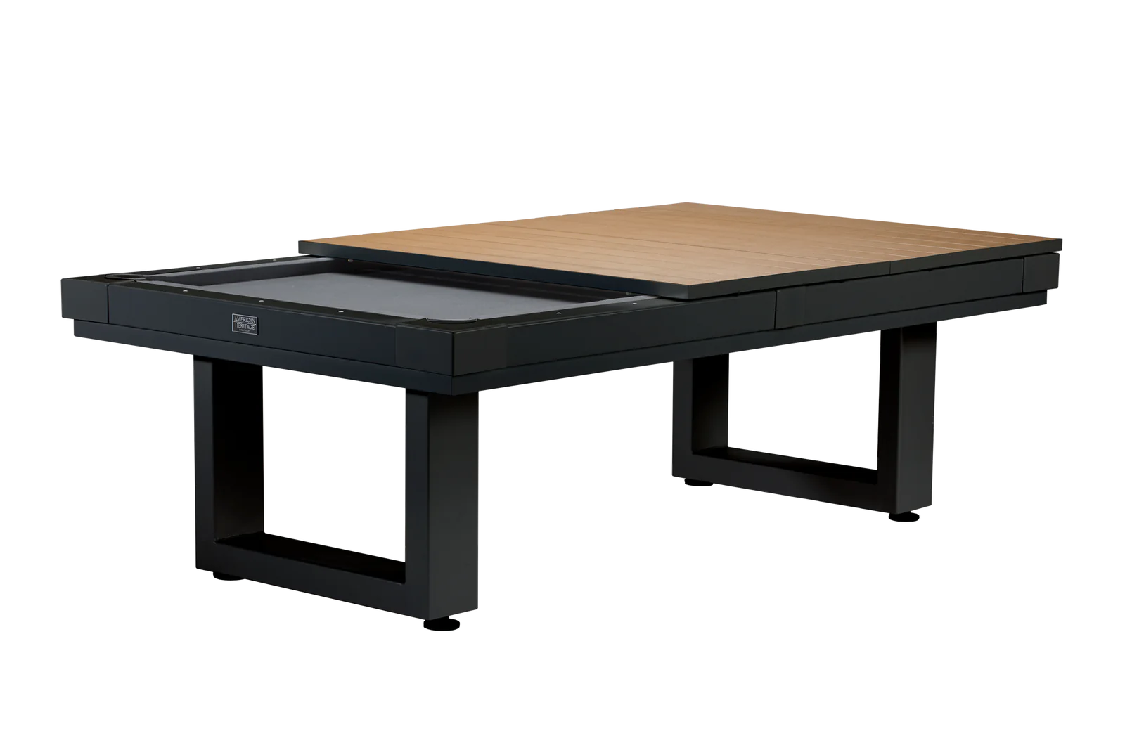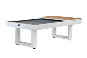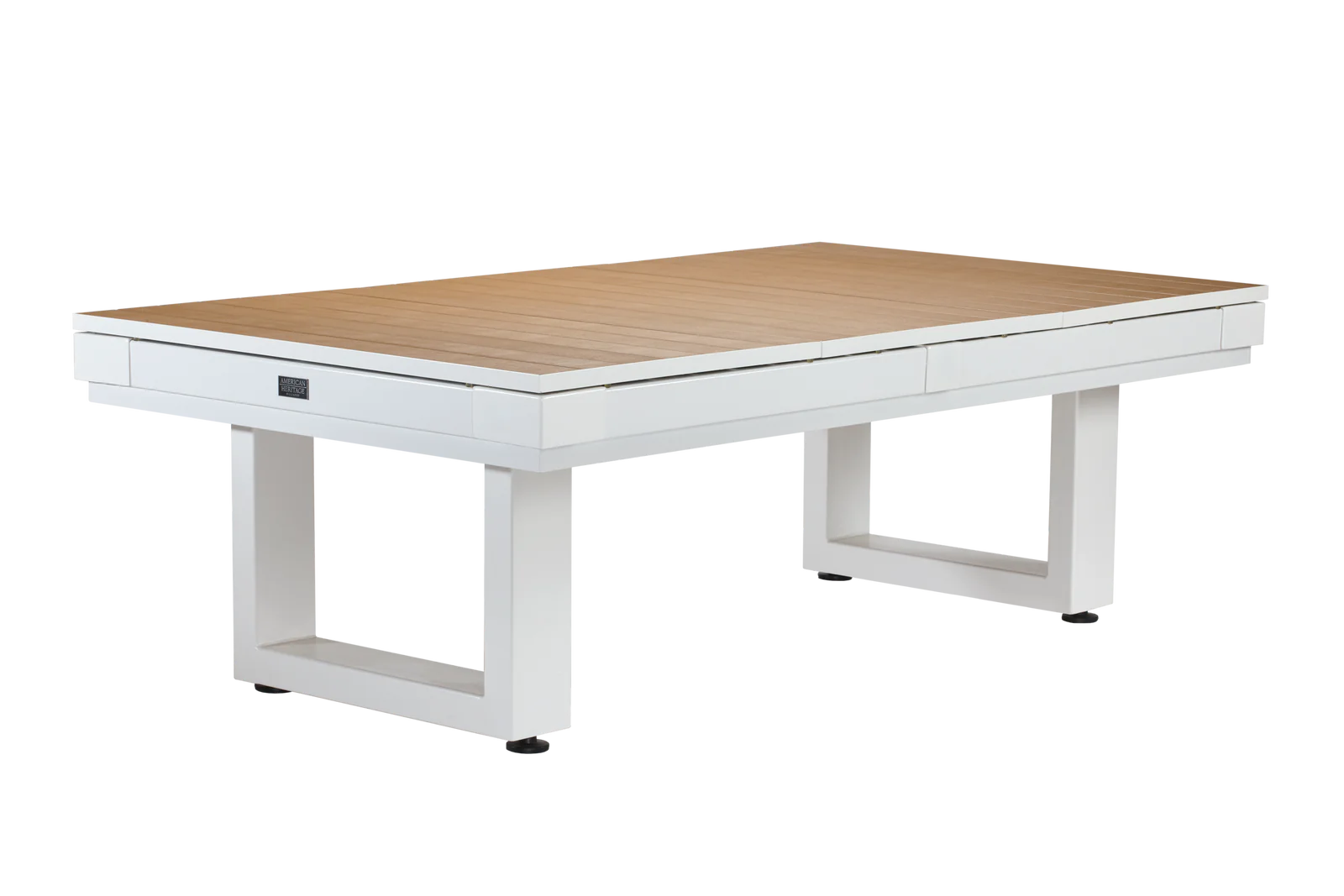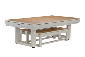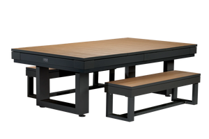 Bring friends and family together this summer with the Lanai Outdoor Set! Built with furniture-grade wood composite material and a durable outdoor powder coat finish, this set includes an 8’ outdoor pool table and two coordinating storage benches. Transform the pool table into a dining table with the included matching dining conversion top. Plus, it comes with all the essentials – 2 outdoor cues, balls, rack, and chalk. Enjoy game night in the fresh air with the Lanai Outdoor Set!