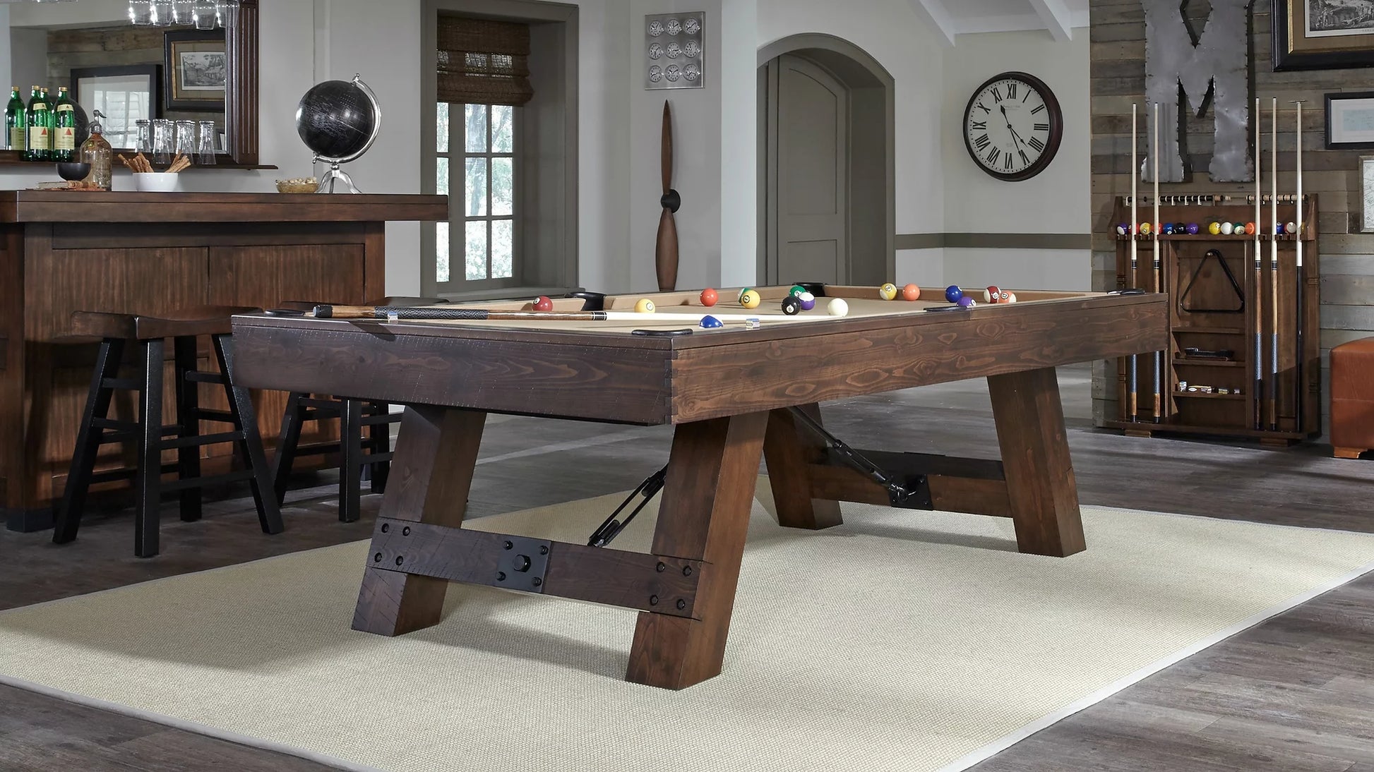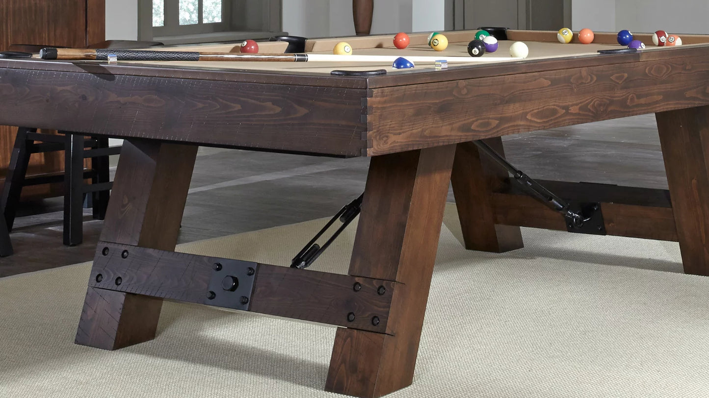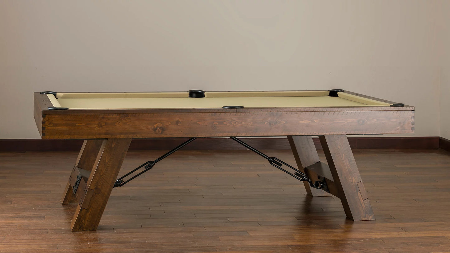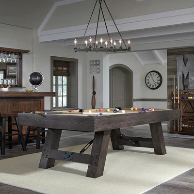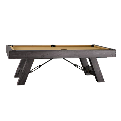 The American Heritage Savannah pool table features a rustic sable finish combined with black, worn industrial hardware that makes the pool table a special addition to any room. The decorative steel turnbuckle element only adds to the unique style of this heirloom.